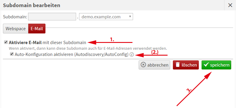 Wir setzen den Haken bei Aktiviere E-Mail mit dieser Subdomain und bei Bedarf auch bei Auto-Konfiguration aktivieren, damit E-Mail-Clients wie Thunderbird die Konfiguration automatisch abrufen können. Anschließend bestätigen wir mit einem Klick auf speichern. Jetzt könnte man sich beispielsweise einen E-Mail-Account für diese Domain anlegen.
